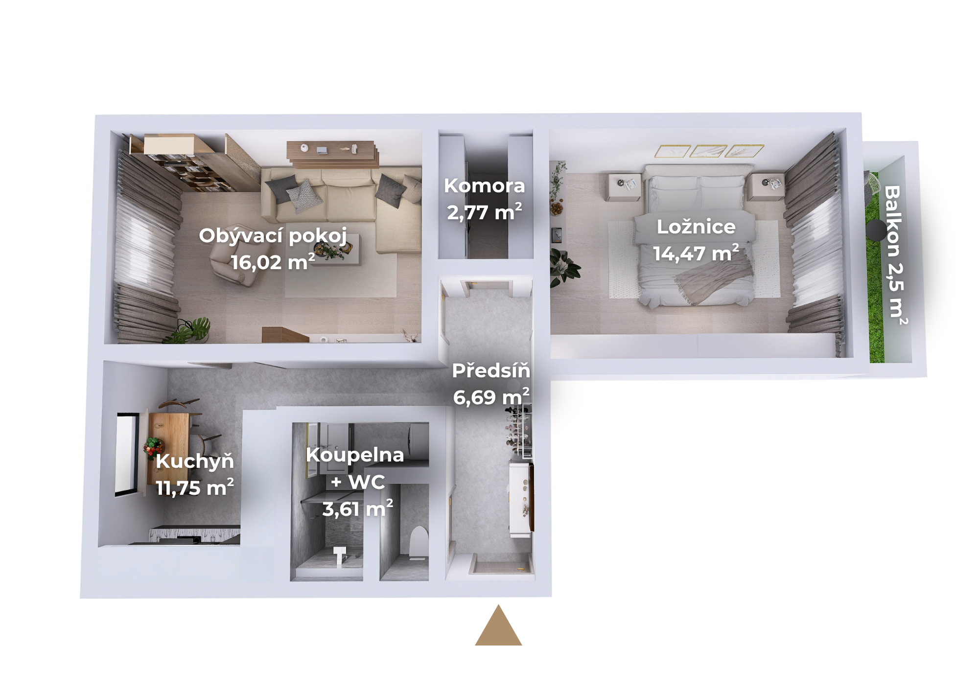 Byt má dispozici 2+1 a podlahovou plochu 55,31 m² + zasklený balkon 2,5 m². Najdete tu obývací pokoj (16,02 m²), ložnici (14,47 m²), samostatnou kuchyň (11,75 m²), komoru (2,77 m²) a koupelnu se samostatným WC (celkem 3,61 m²). Nachází se ve vyvýšeném přízemí, což oceníte třeba s nákupem, kočárkem nebo když prostě nechcete řešit schody (výtah zatím není, ale plánuje se).