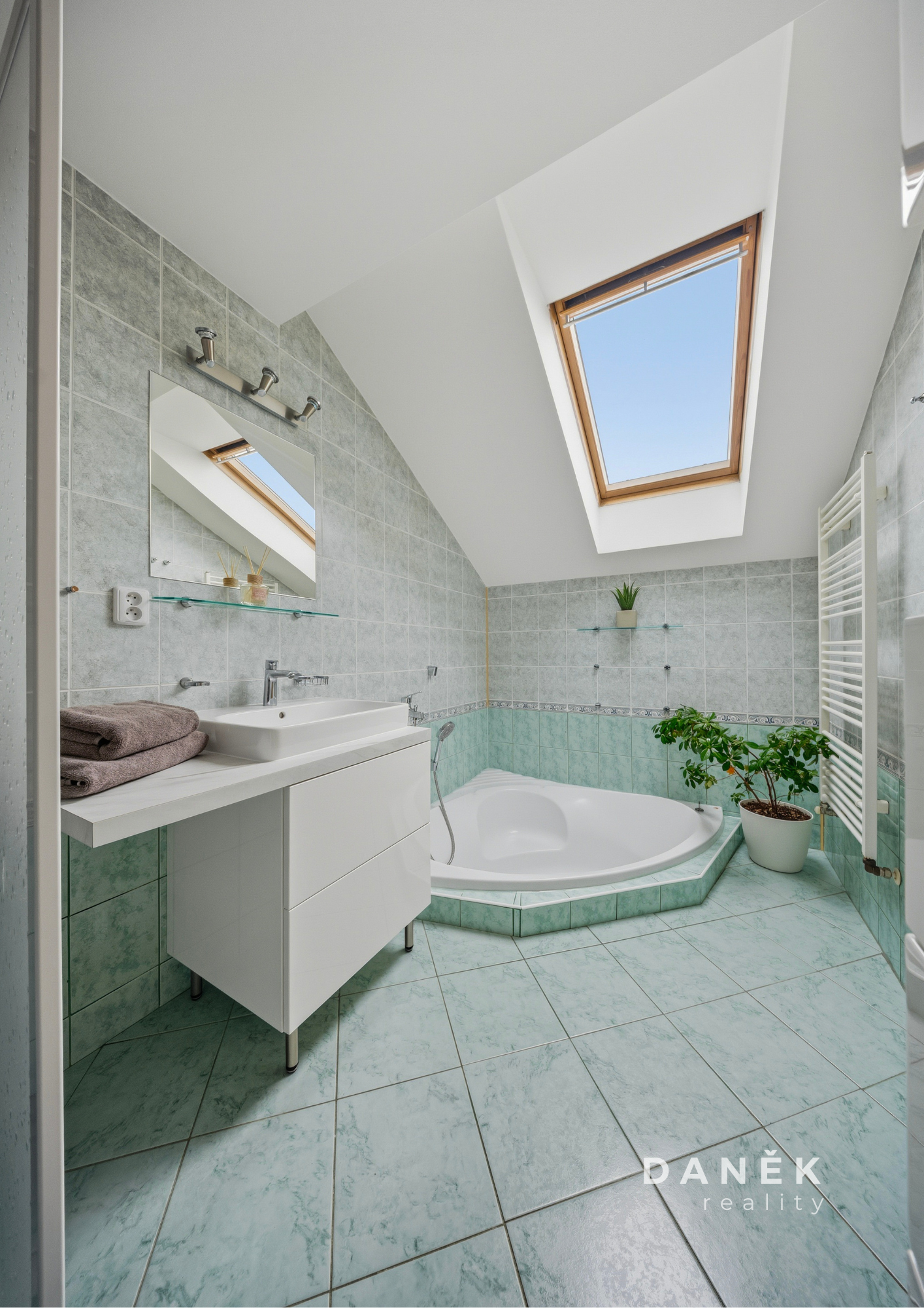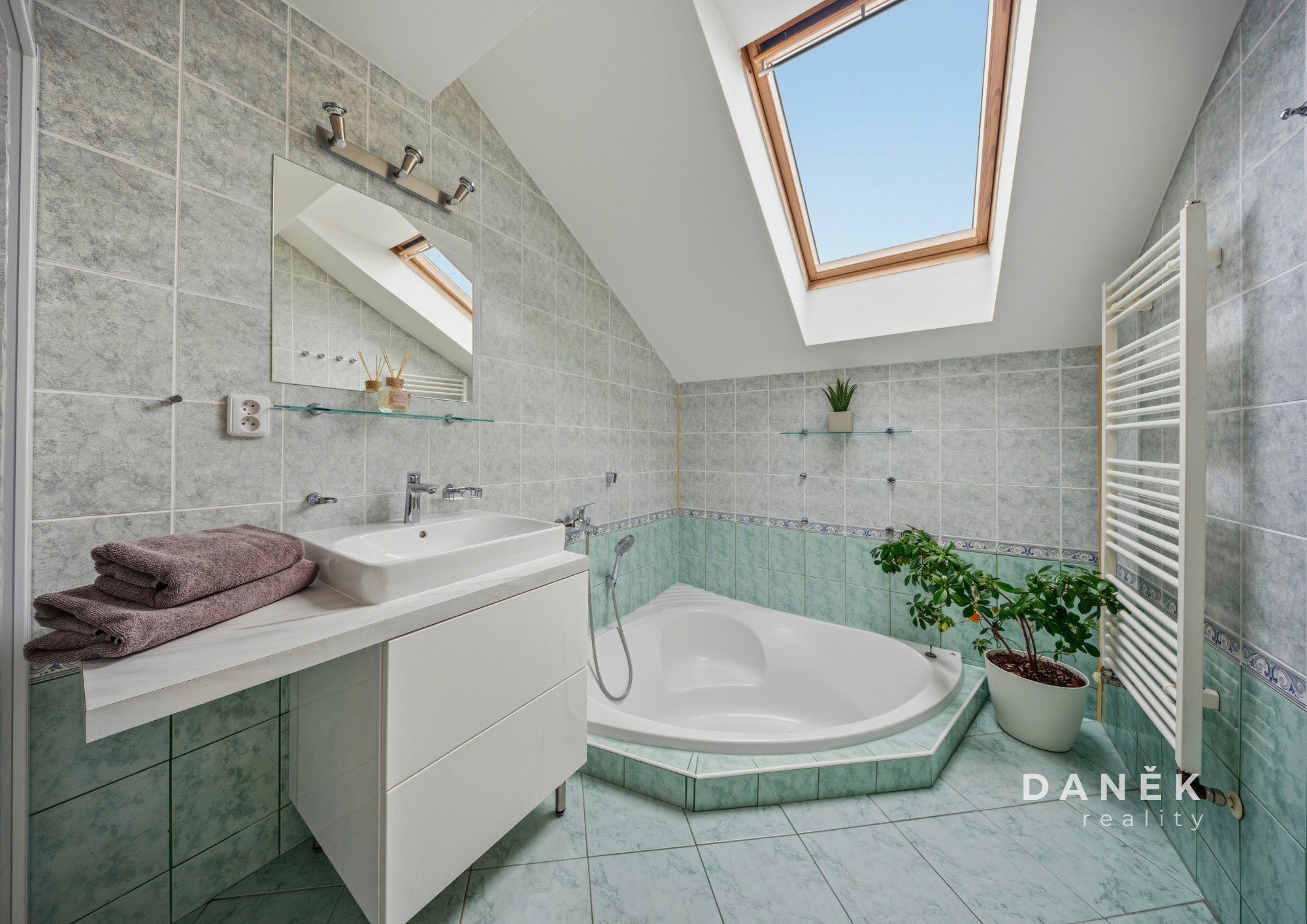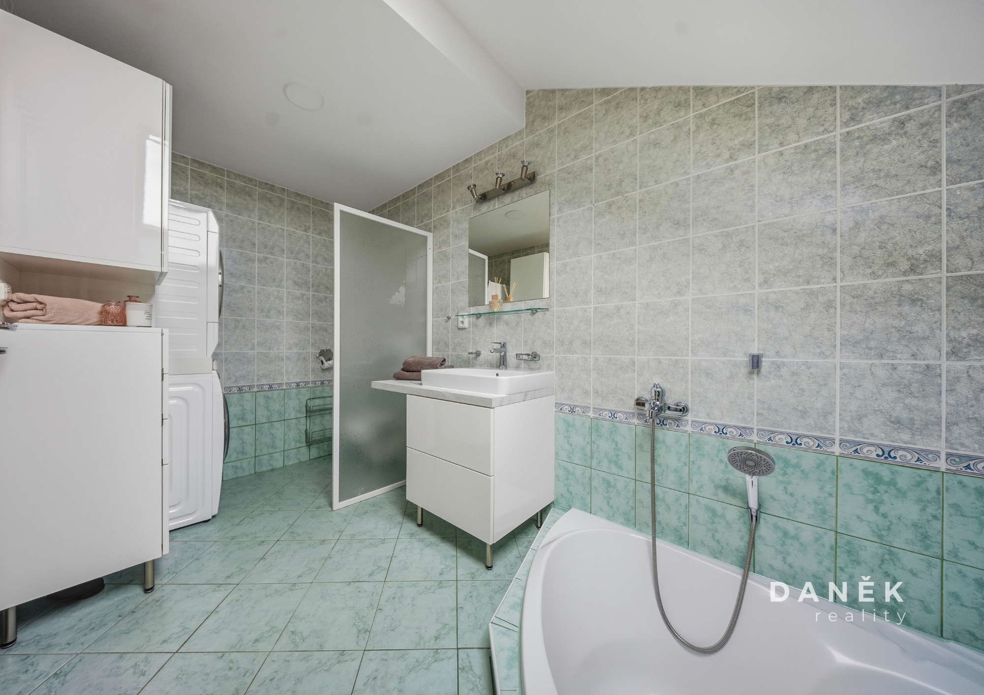 V koupelně najdete zapuštěnou rohovou vanu, závěsné WC Geberit a dostatek prostoru pro pračku a sušičku. Ty mohou v bytě zůstat po dohodě, stejně jako část dalšího vybavení.