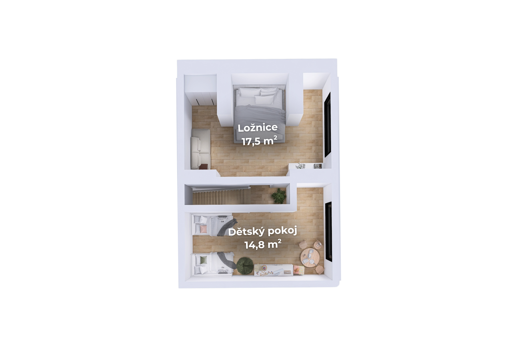 Horní patro pak nabízí klidovou část oddělenou od života dole (orientační rozměry):