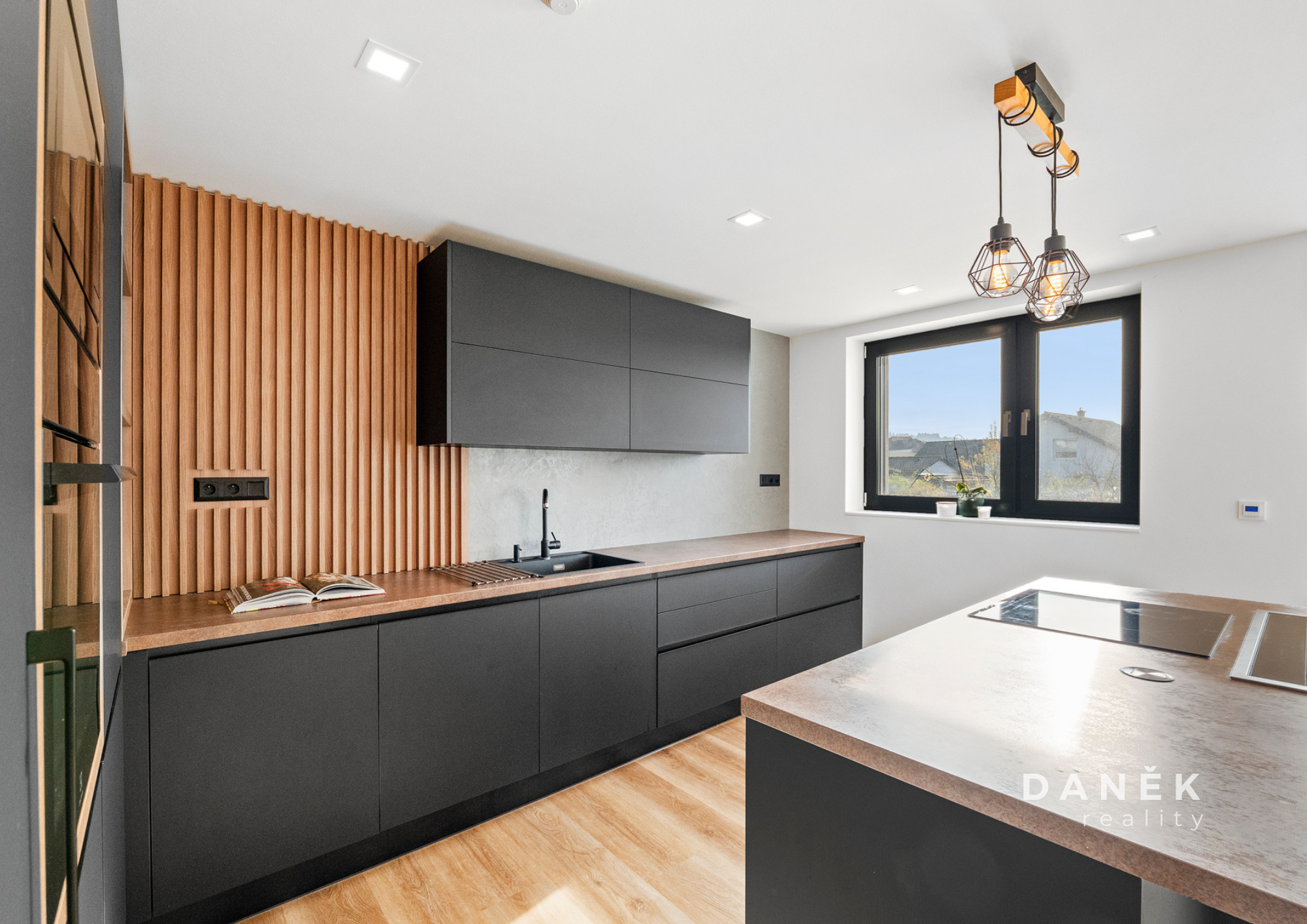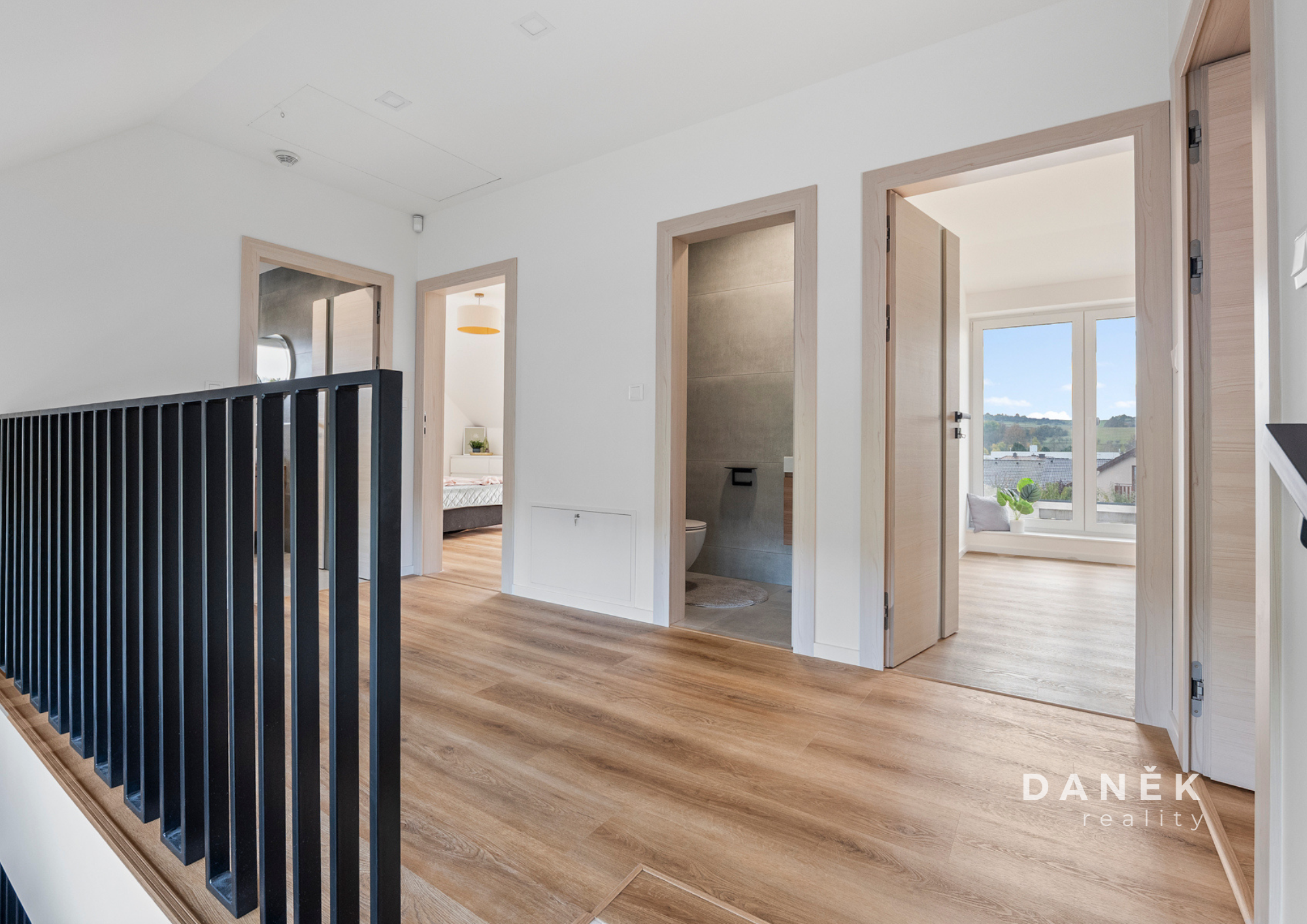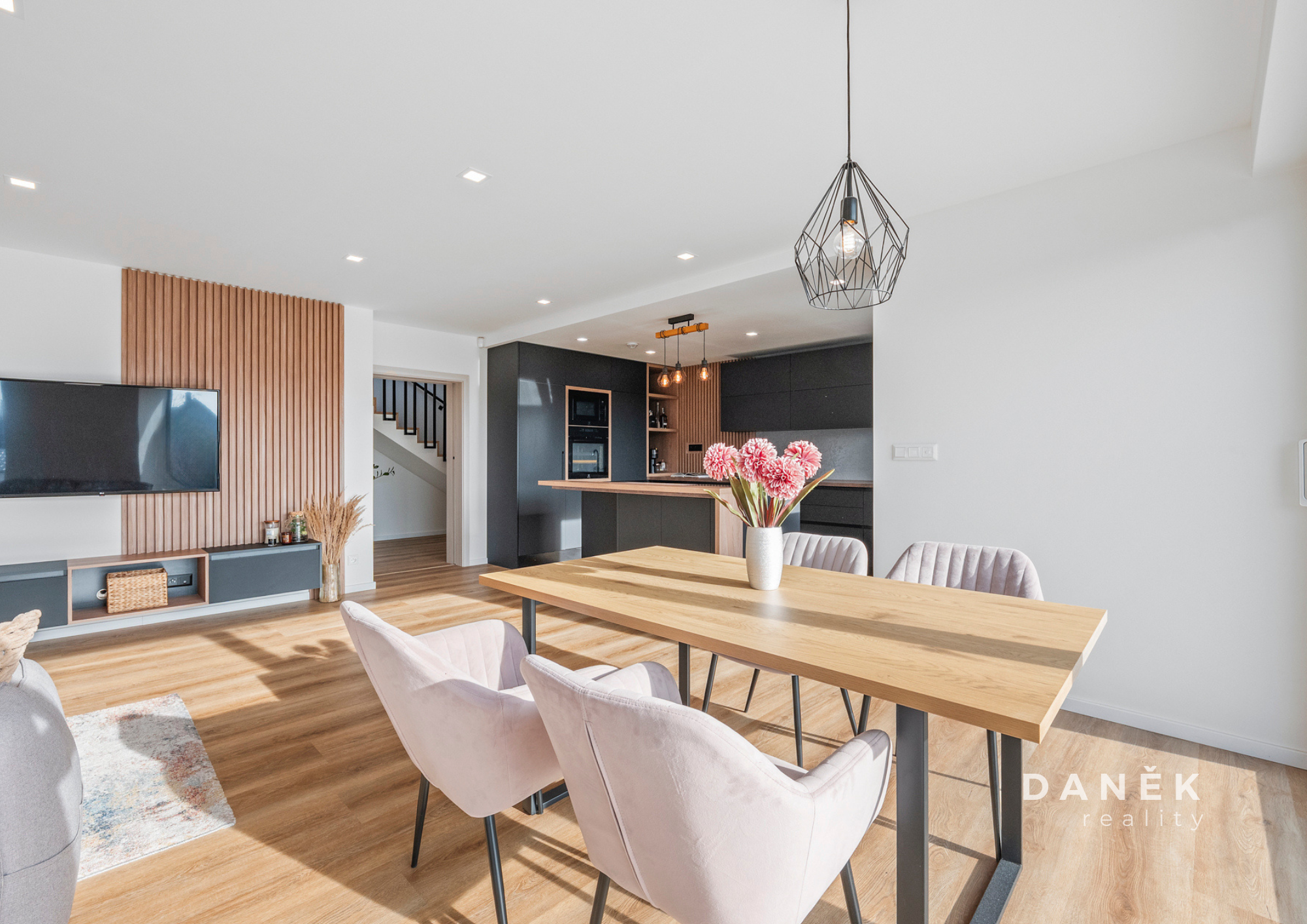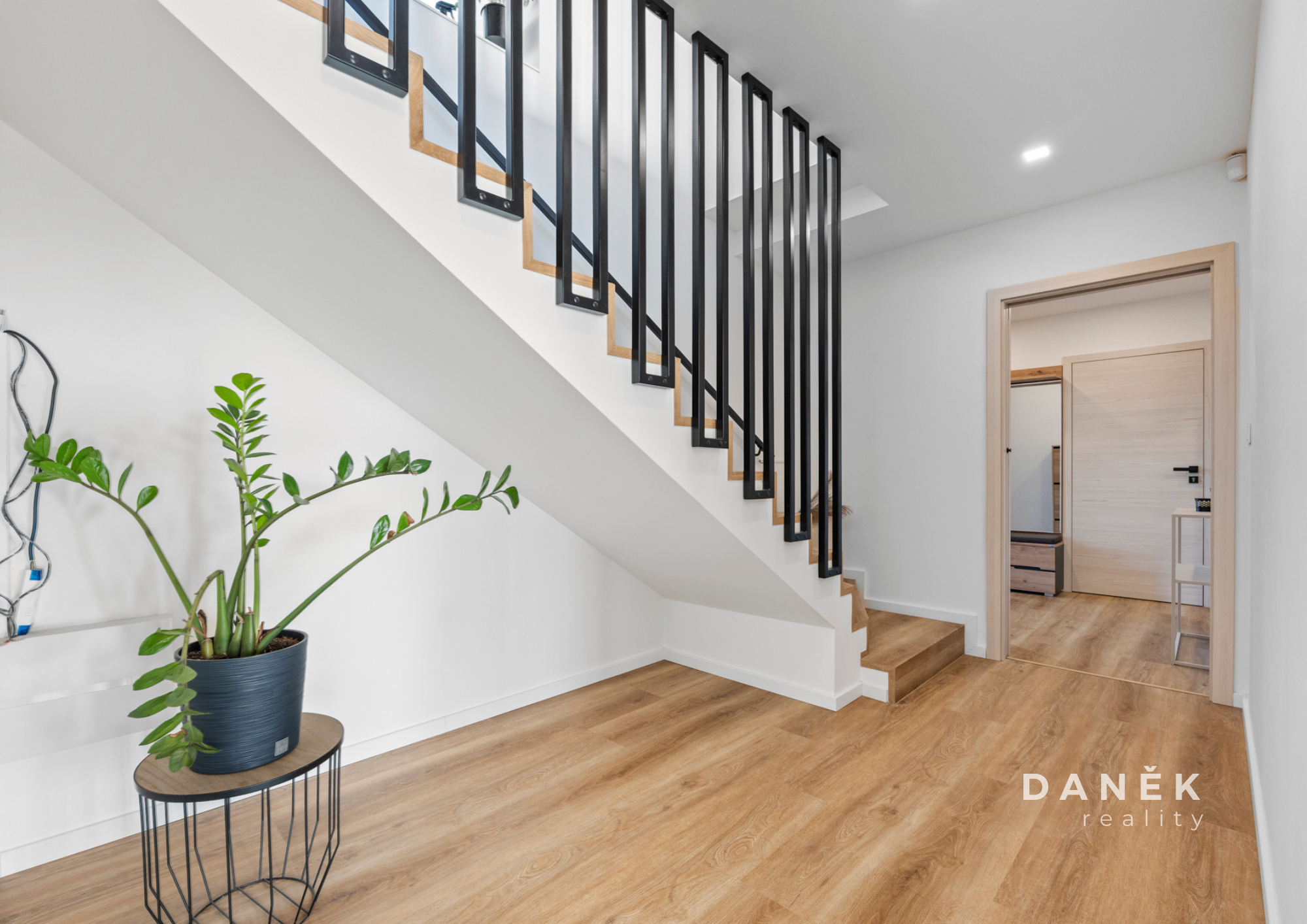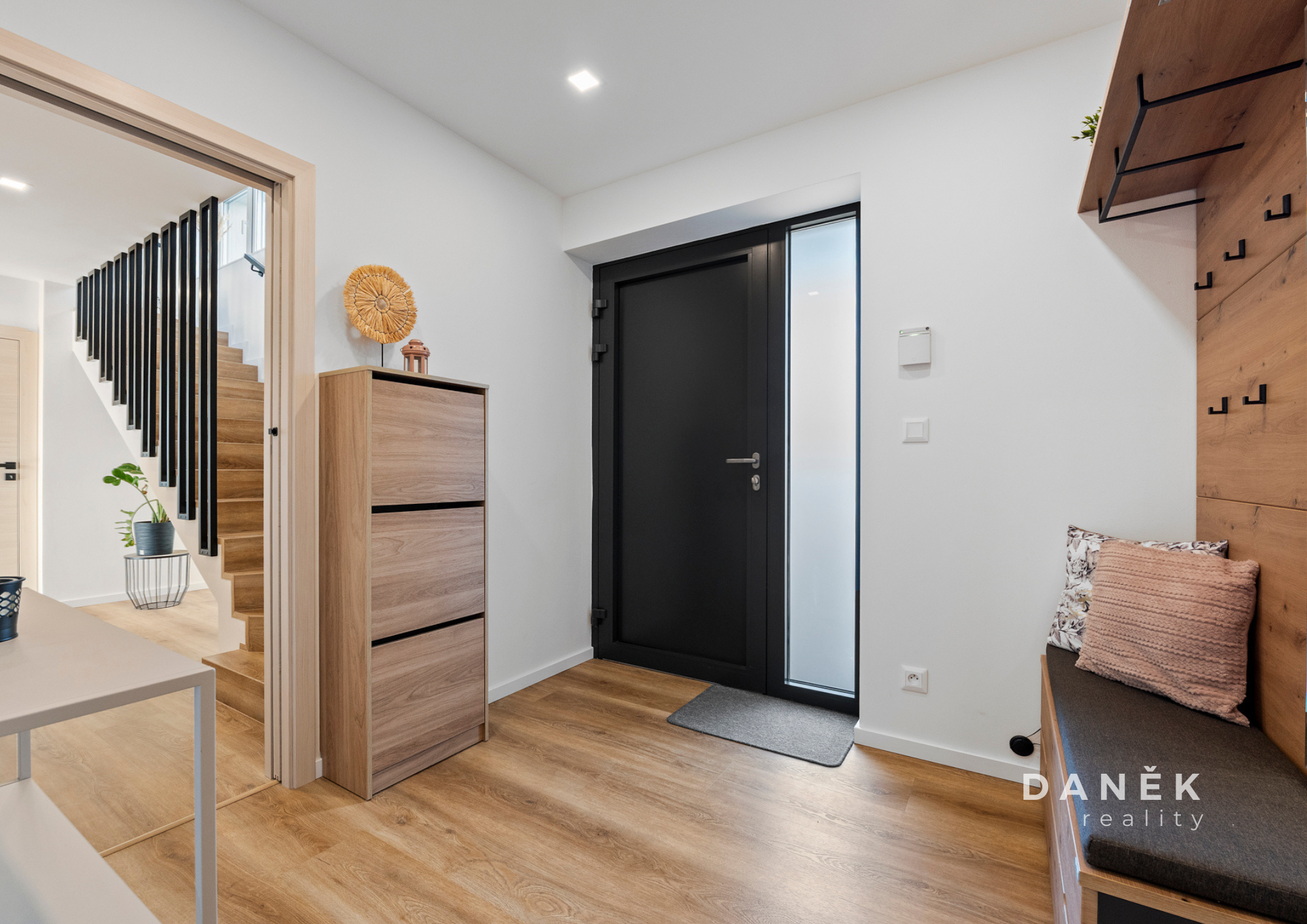 Interiér byl navržen s důrazem na detail, kvalitu a funkčnost – nabízí vyšší standard, než bývá běžně. Vinylové podlahy v celém domě. Designová kuchyně na míru, která je plně vybavená spotřebiči. Vestavěný nábytek, dýhované dveře Sapeli a kvalitní obklady. HS portál v antracitu – propojuje obývací prostor s terasou. Dvě koupelny – jedna s vanou, druhá se sprchovým koutem. Vinylový obklad schodiště, betonová stěrka a precizní řemeslné detaily. V domě se snoubí elegance, praktičnost a teplo domova – každý detail byl promyšlen.