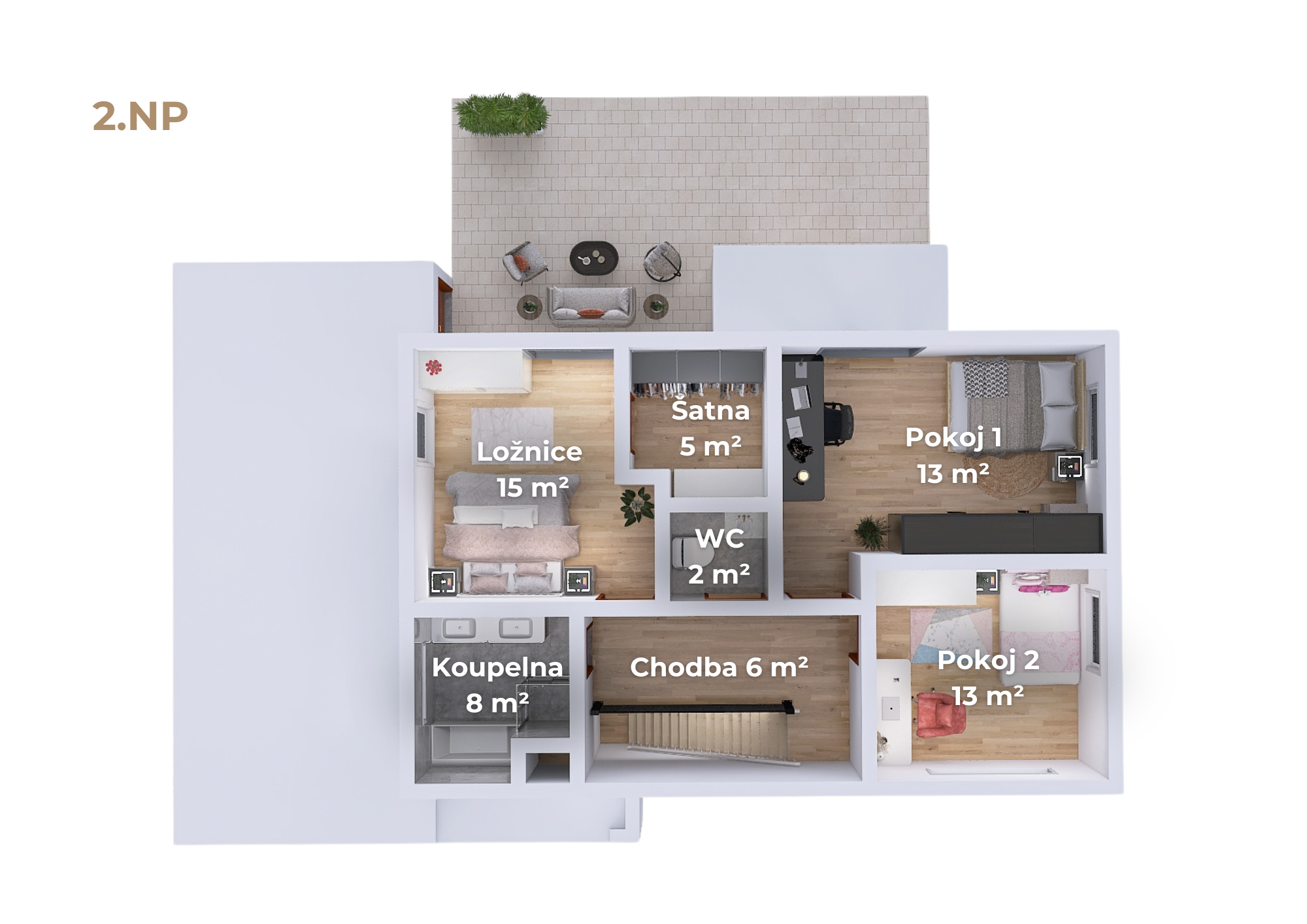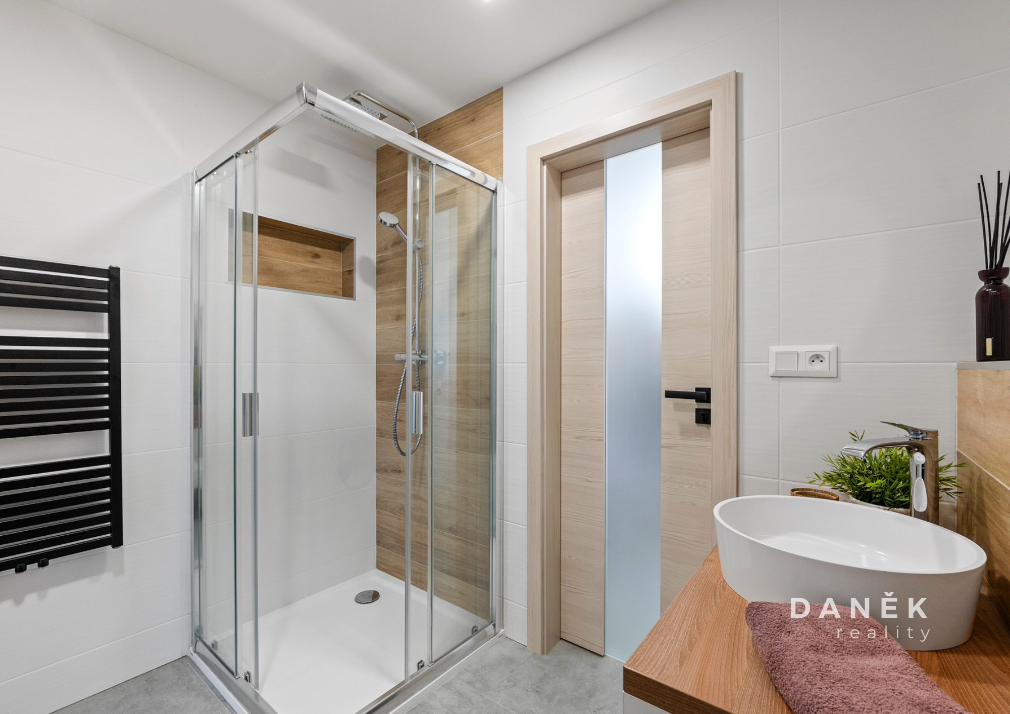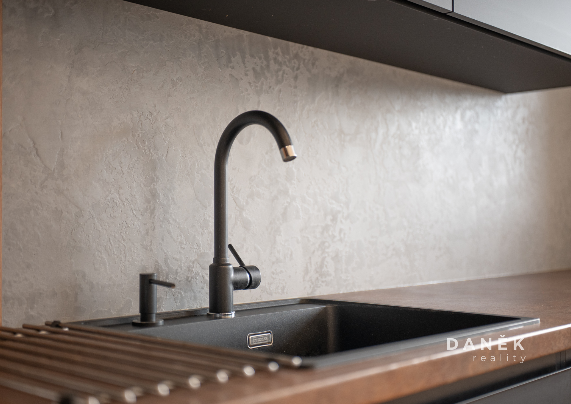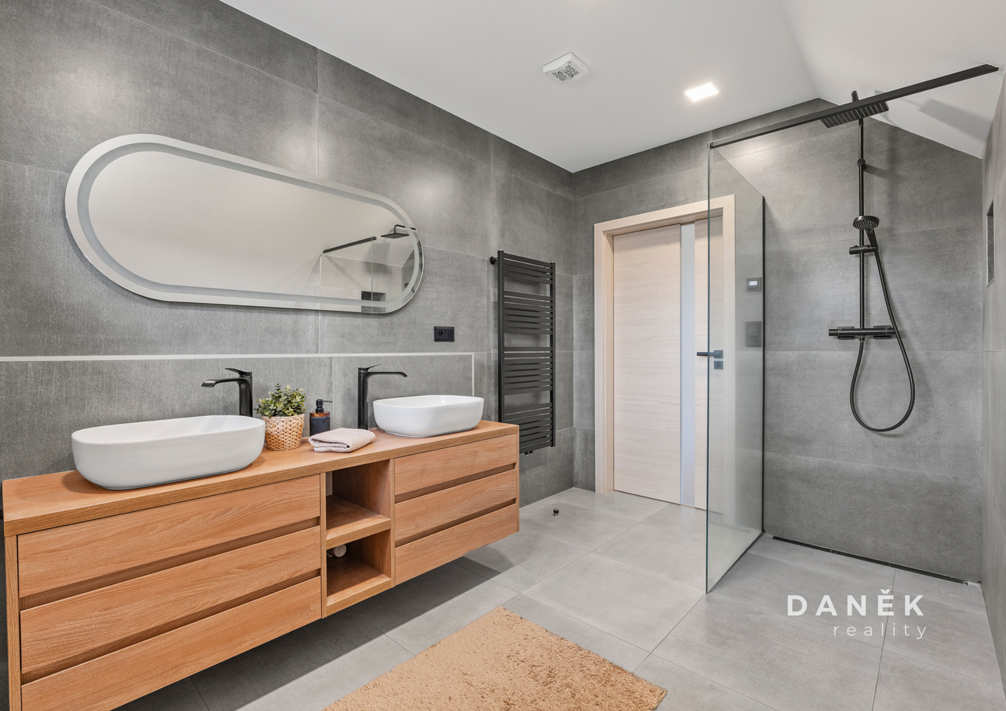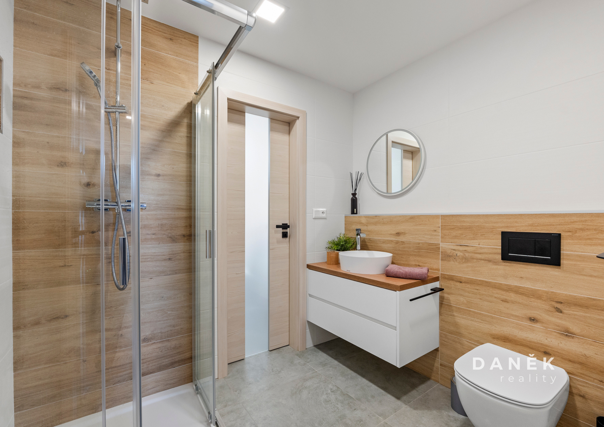 Interiér byl navržen s důrazem na detail, kvalitu a funkčnost – nabízí vyšší standard, než bývá běžně. Vinylové podlahy v celém domě. Designová kuchyně na míru, která je plně vybavená spotřebiči. Vestavěný nábytek, dýhované dveře Sapeli a kvalitní obklady. HS portál v antracitu – propojuje obývací prostor s terasou. Dvě koupelny – jedna s vanou, druhá se sprchovým koutem. Vinylový obklad schodiště, betonová stěrka a precizní řemeslné detaily. V domě se snoubí elegance, praktičnost a teplo domova – každý detail byl promyšlen.