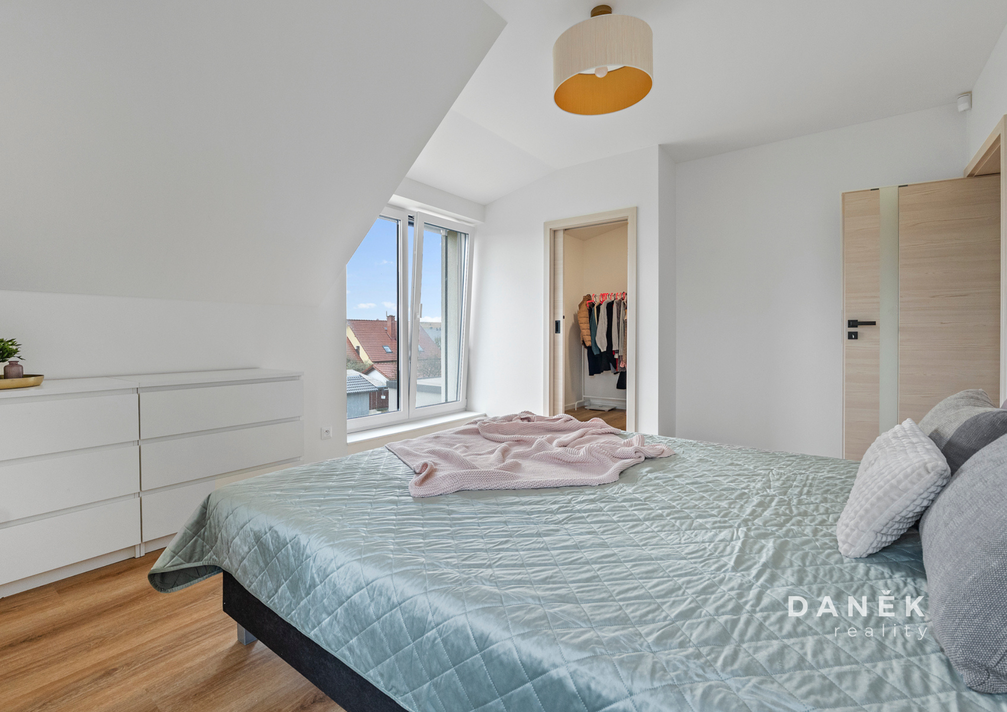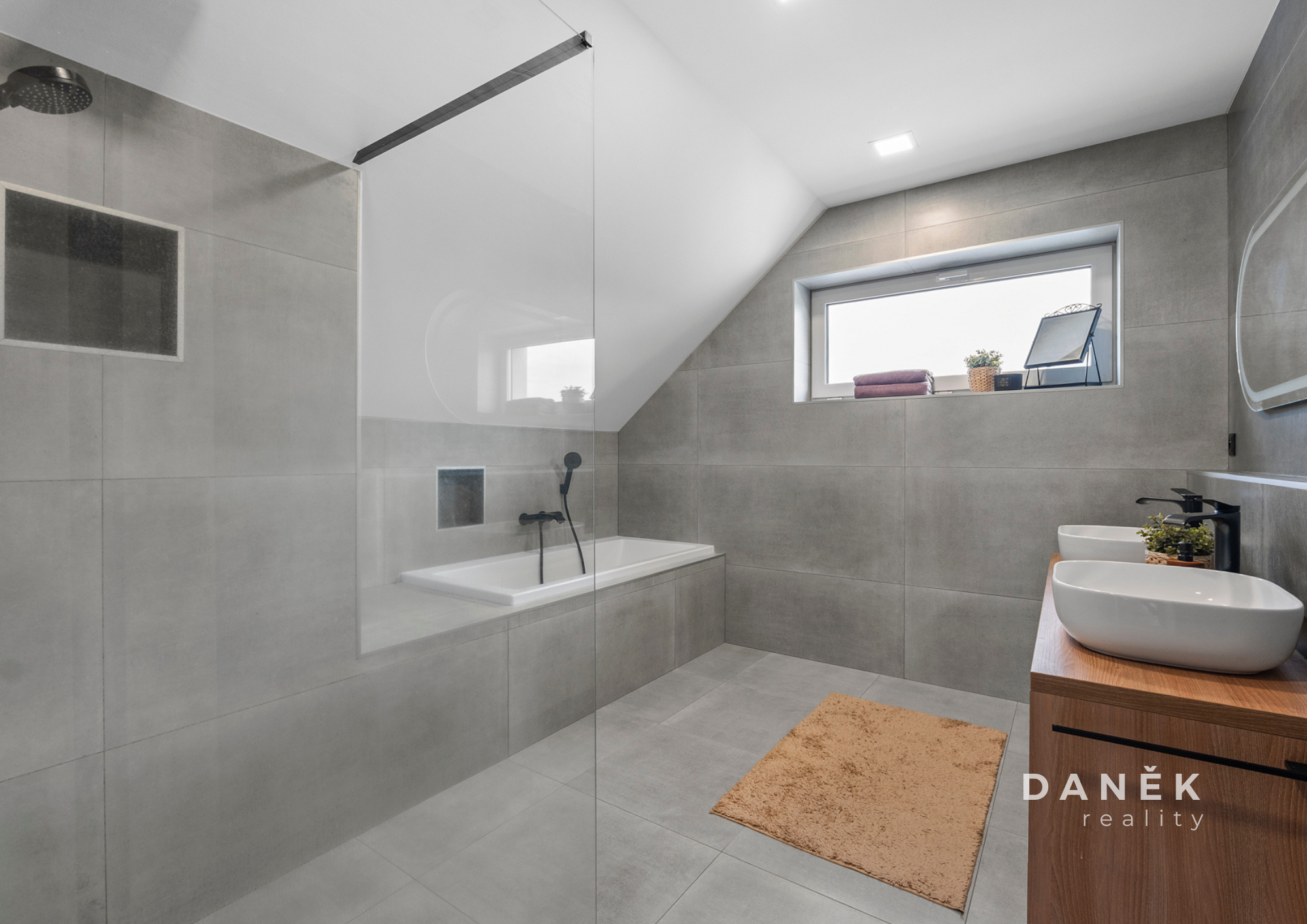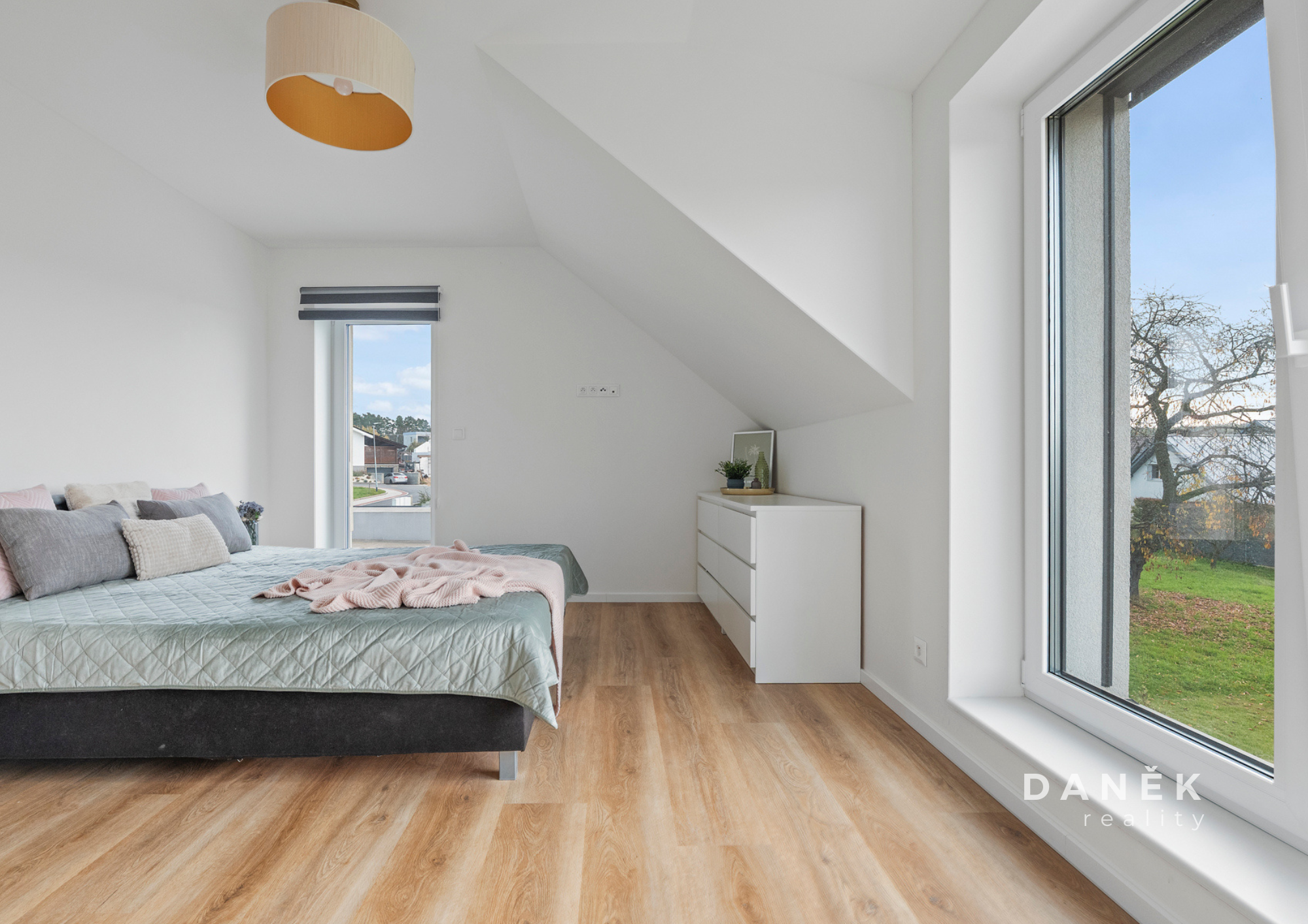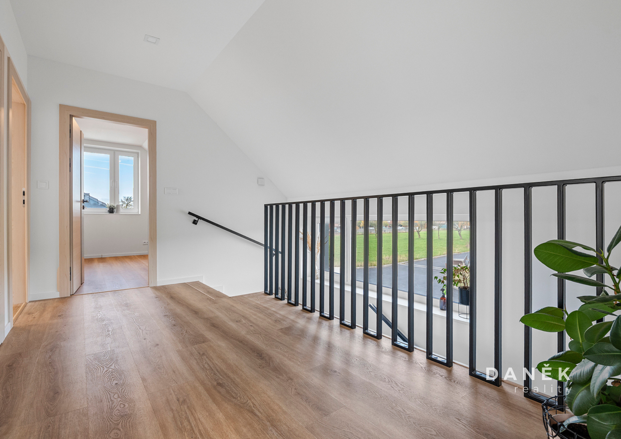 Tento elegantní dům o dispozici 5+kk a užitné ploše 146 m² (celková plocha včetně garáže 171 m²) zaujme na první pohled promyšlenou architekturou, kvalitním zpracováním a útulnou atmosférou. Byl kolaudován v roce 2023 a nachází se na slunném pozemku o výměře 907 m² v klidné části obce.
