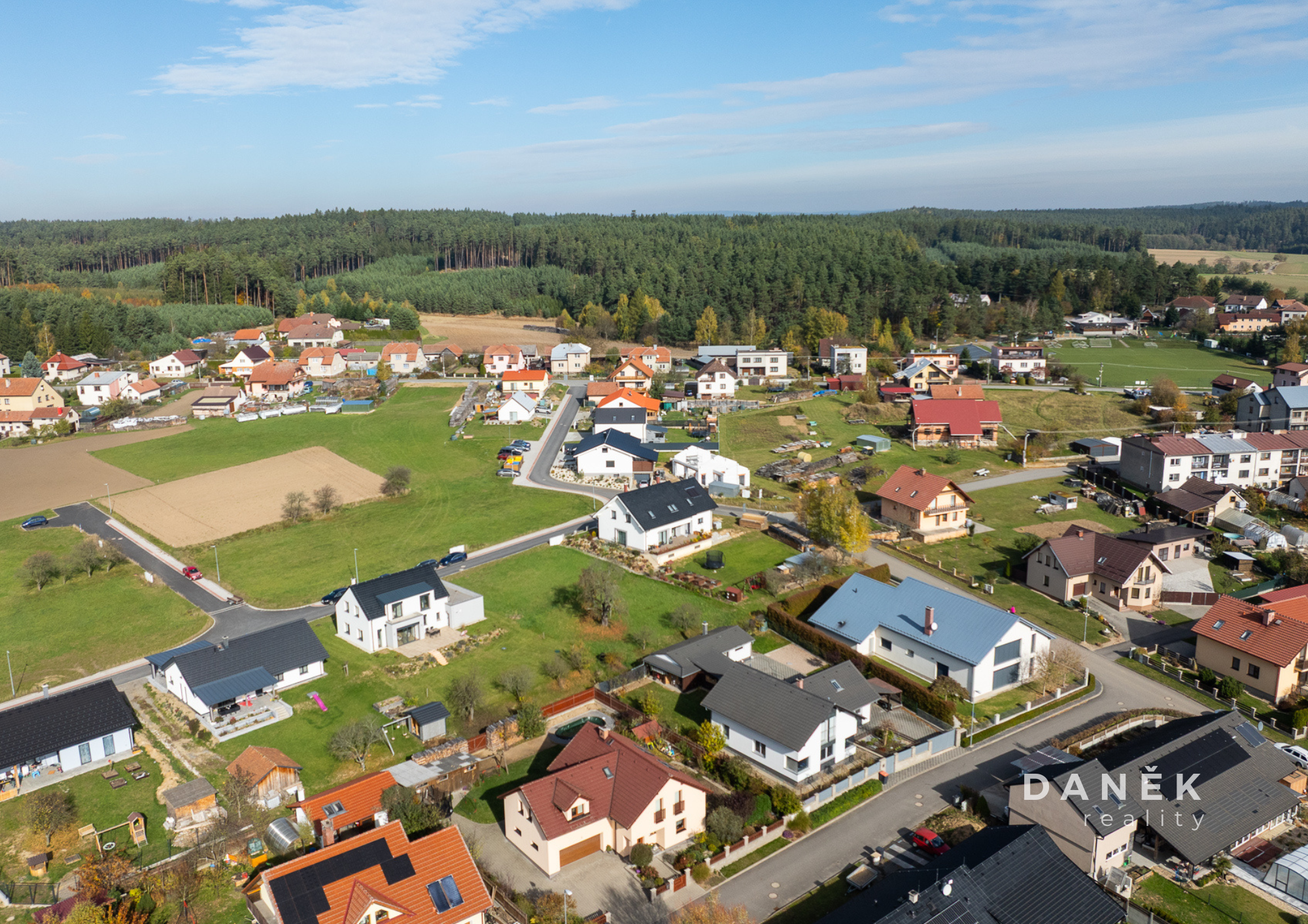 Pozemek o rozloze 907 m² nabízí dostatek prostoru pro zahradu, odpočinek i hry dětí, přitom zůstává nenáročný na údržbu. K dispozici je retenční nádrž s čerpadlem pro zavlažování, zpevněná příjezdová cesta, garáž a terasa s krásným výhledem. Ulice je velmi klidná, bez provozu a průjezdu aut – ideální pro rodinný život.